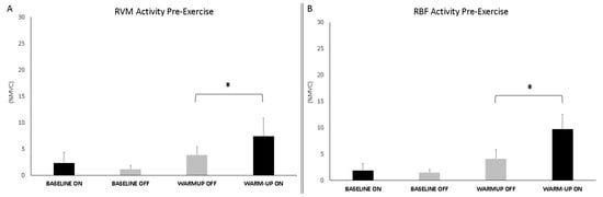 Bar graphs represent the root mean square (RMS) of the normalized EMG values of the RVM (A) and RBF (B) at the baseline and during warm-up across experimental conditions (PEMF ON vs. OFF). Data are shown as mean ± SD. The asterisk indicates significant differences at p < 0.05.
