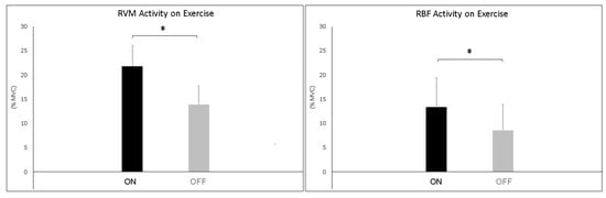 Bar graphs represent the root mean square (RMS) of the normalized EMG values of the RVM and RBF during constant-load exercise across experimental conditions (PEMF ON vs. PEMF OFF). Data are shown as mean ± SD. The asterisk indicates significant differences at p < 0.05.
