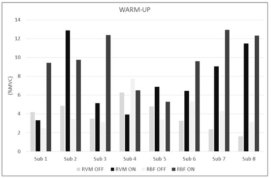 The analysis during warm-up showed significant differences between conditions (ON vs. OFF) for both muscles (RVM: F1,16 = 7.034; p = 0.019; np2 = 0.334; RBF: F1,16 = 23.912; p < 0.001; np2 = 0.631). Baseline and warm-up data are shown in Figure 5.
