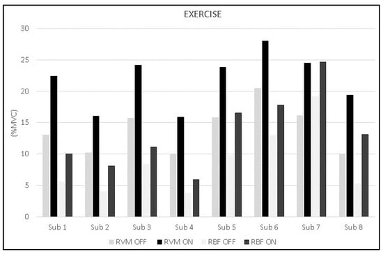 The analysis during constant-load exercise showed significant differences between conditions (ON vs. OFF) only for the RVM (F1,16 = 14.999; p = 0.002; np2 = 0.517). Figure 6 shows the average data of the exercise phase for both muscles. Data from single subjects in all conditions are shown in Figure 7 and Figure 8 for warm-up and exercise, respectively.