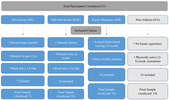 The research included a sample of 7 elite male karate competitors (KE), 14 sub-elite male karate competitors (KSE), 16 male individuals that have undergone basic karate training (KB), and 14 physically active and healthy controls of the same age and gender as the karate subgroups—non-athletes (NA)—Table 1. The inclusion criteria for the above-mentioned groups are given at the Figure 1.