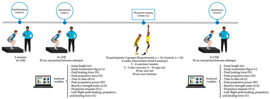 Prior to the first assessments, the students underwent familiarization with the CMJ test during the preceding week. This familiarization process took place over two sessions, with a total of six jumps. The study lasted for six weeks, with the first and last weeks dedicated to neuromuscular performance assessments, while the other four weeks were allocated to the implementation of the plyometric training program. Two lead investigators, both certified with the CSCS and with over 10 years of experience as researchers and physical education teachers, conducted the assessments as well as the plyometric training program. The chronological outline of the study can be found in Figure 1.