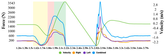 The vertical ground-reaction force applied during each jumping test was collected using a wireless dual-force-plate system with a sample rate of 1000 Hz (Hawkin Dynamics, 4th Generation; Westbrook, ME, USA) and Hawkin Dynamics software (version 9.6.0). The system was zeroed before each trial. The force–time and force–velocity curves of a CMJ obtained through the Hawkin Dynamics software (v9.6.1) can be viewed in Figure 2.