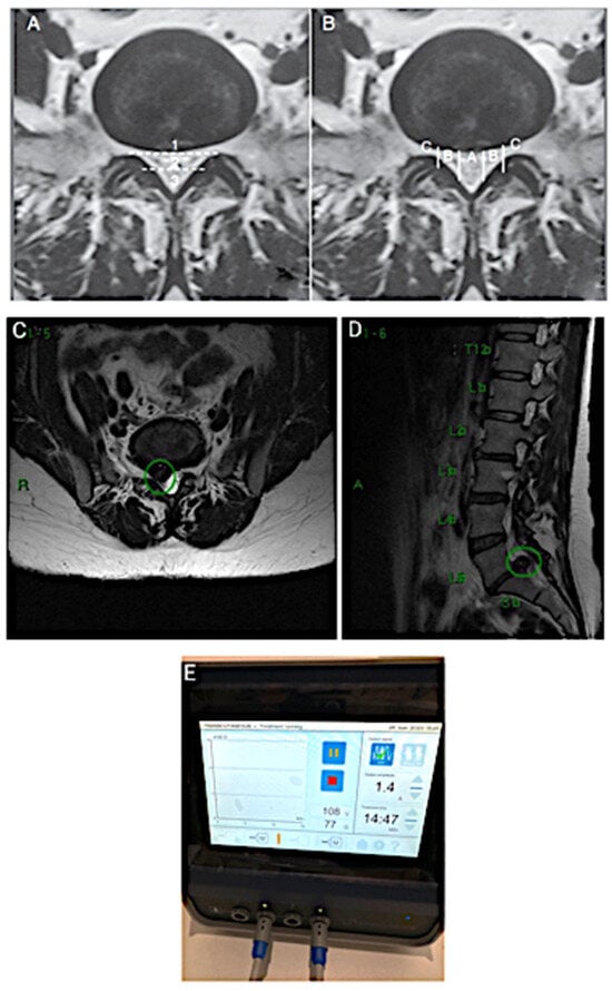 Given these limitations, and with her consent, we opted to apply transcutaneous STP radiofrequency as a therapeutic alternative. Medium adhesive plates were placed on the lumbar spine at the level of the hernia and along the sciatic path in the right buttock, where the pain radiated. A Spring2® generator (from Springlife Medical, Driebergen, The Netherlands) with medium patches was used, and the PRF STP was set to 1.4 A for 15 min, generating 108 V (Figure 1E).