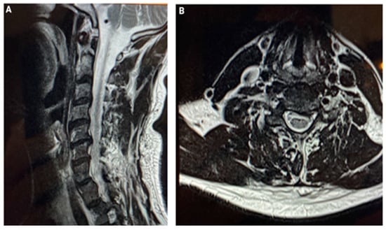 He presented his MRI images (Figure 3A,B). Since he was unable to take time off work for invasive treatments and desired an immediate solution, we suggested Transcutaneous Randomized Pulsed Radiofrequency (STP). After obtaining informed consent, we treated him with three sessions using two small patches for 15 min each, set to 0.8 A and 45 V. The second session took place 15 days after the first, and the final session occurred 45 days after the initial application.