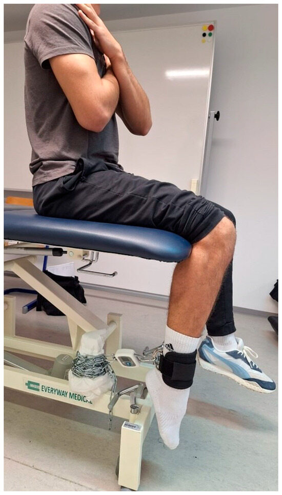 Before starting testing with the EasyForce® dynamometer, one must ensure that the test environment addresses the infrastructural requirements for proper installation of the device. The test setup must be stable, with one end of the dynamometer attached with a hook to a chain that is attached to a fixed, immovable object, while the other end is attached to a cuff that is placed on the participant, in a location depending on which muscle group is being tested. A chain is a much more stable option than straps or elastic bands, as it reduces the likelihood of unwanted leg movement during the test. Any joint movement during the measurement can lead to a shift from isometric to isotonic contraction and, therefore, affect the validity of the data. Stabilization of the body during the test plays a crucial role in ensuring valid results. If the tests are performed in a seated position, participants should hold on to the edge of the table to prevent movement of the upper body. In the supine position, stabilization is naturally achieved through contact with the surface, although it is also possible to hold on to the edges of the table. Before measuring, it is important to ensure the correct positioning of the joints; for QF muscle strength testing, most commonly at 90° knee flexion, as even minimal deviations can affect muscle length and strength production. A small pillow or rolled-up towel can be placed under the knee to ensure an even and stable flexion angle. This prevents unwanted lowering or raising of the lower leg during the test, which could otherwise change the muscle length and influence the strength measurements. The maximum contraction should be maintained for three to five seconds. This duration of maximum contraction is considered in the literature [39,40,41], but individual adaptation is possible depending on the characteristics of the participants. We also recommend standardizing the verbal instructions and, if possible, providing visual feedback during the test to allow a uniform maximum effort. Finally, to improve reproducibility, it is advisable to document all test parameters, including body position, table height, chain length, and hook/chain contact points, to allow reliable replication in future studies. Taking these factors into account can significantly reduce measurement variability and improve the reliability of HHFD and EasyForce® protocols. This supports their effective application in the clinical setting and improves consistency compared to isokinetic systems.