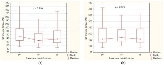 The median, as well as the lower and upper quartiles, of the torque of the QF muscle measured with the IKD were higher in the DF position, with 151.00 (127.00–195.00) Nm, than in the PF position, with 127.00 (113.00–168.00) Nm, and in the N position, with 136.00 (115.00–183.00) Nm (Figure 3a).