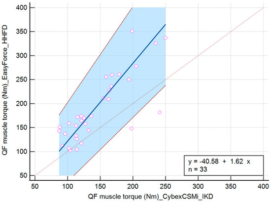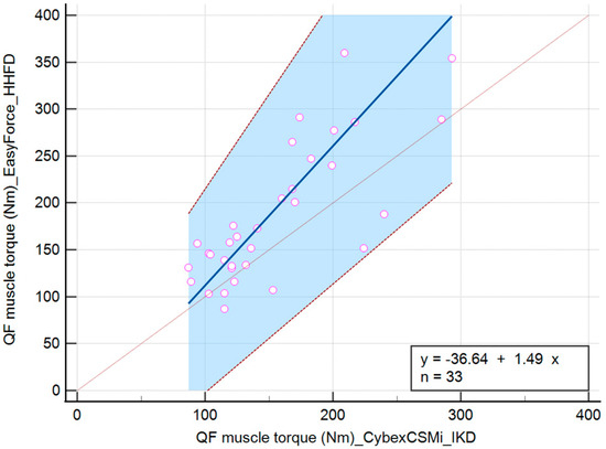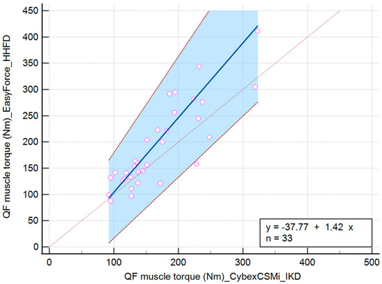 To evaluate the agreement of QF muscle torque results at different positions of the talocrural joint between the IKD and HHFD methods, Passing–Bablok regression with a Scatter plot diagram and Spearman’s correlation was used.