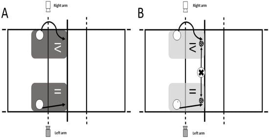 Study design. (A): run-up and S without a ball in zones II and IV; (B): run-up and S with a ball in zones II and IV; white circle: participants performing the action; “x” circle: setter.