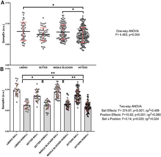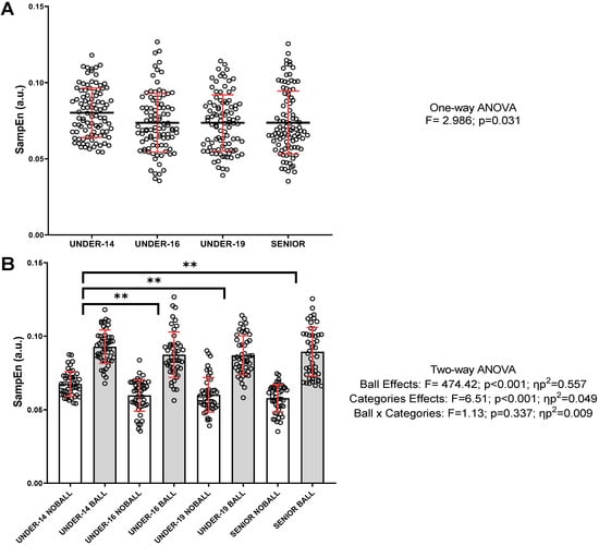General values and the influence of the ball during the S action on the entropy values (SampEn) for each category. (A) The general SampEn values (with and without the ball) divided by category. (B) SampEn values for the S with and without the ball for each category. Individual values, means, and standard deviations are shown. In (A) The mean is represented by a black line and the standard deviation by a red line. Statistical significance: ** p < 0.01; ηp2: partial eta squared.