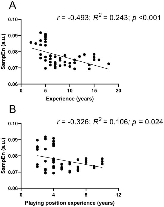 Figure 5 shows the regression lines between years of experience playing volleyball and years of experience in the playing position, with the average SampEn values obtained across all strikes (average of the 48 executed strikes). Significant correlations were observed both with total experience (r= −0.493; R2 = 0.243; p < 0.001) and with years of experience in the playing position (r= −0.326; R2 = 0.106; p = 0.024).
