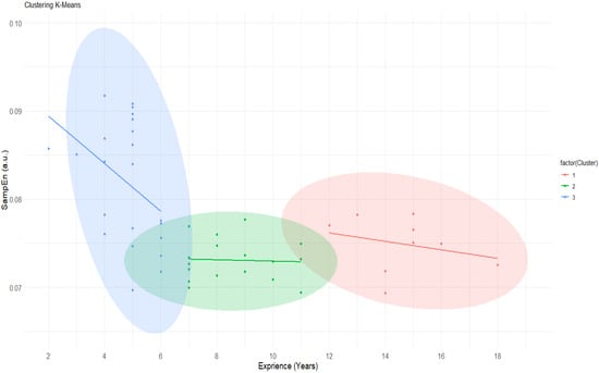 Finally, Figure 6 shows the cluster analysis. The elbow method determined that the present data should be defined by three clusters to be analyzed using the K-means clustering method. In Figure 6, three clearly defined groups can be observed, where a first group (blue) shows high levels of entropy (SampEn), a second group (green) is in the intermediate years of experience where SampEn values stabilize, and a final group (red) includes players with more years of experience and SampEn values similar to those in the green group.