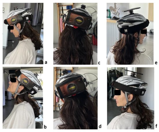 Measurements of cervical spine ROM in flexion (a), extension (b), right- and left-side flexion (c,d), and right and left rotation (e,f).