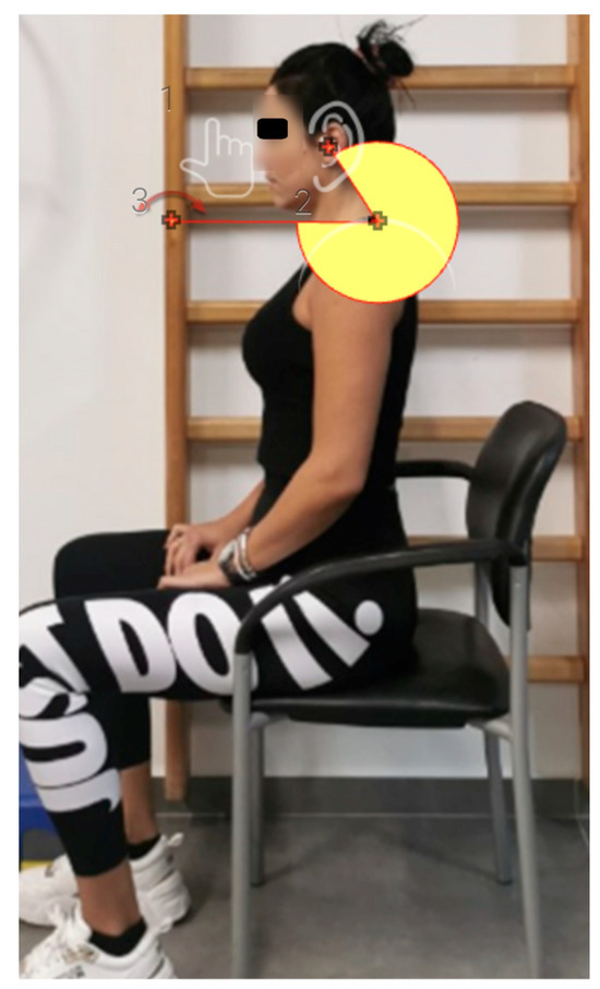 The craniovertebral angle (CVA) is the angle formed by the line connecting C7 to the tragus of the ear and a line parallel to the horizontal plane passing through the C7 marker. During the initial visit, the seventh cervical vertebra (C7) was palpated, and a marker was placed on the skin surface over the tip of its spinous process. Subsequently, the patients were asked to sit relaxed in their natural sitting position, with their feet together, touching the ground, and their hands resting on their legs. They were also asked to look at a specific point at eye level. The examiner adjusted the tripod and smartphone so that each participant’s head and cervical spine were clearly depicted. The camera was positioned 3 m away from the patient, and three lateral photographs were taken. Participants were not allowed to lean against the backrest of the chair or lean their body forward in a relaxed position [29]. The ‘Forward Head Posture-FHP’ app was used to calculate the CVA (https://play.google.com/store/apps/details?id=com.ysjworld.fhp&hl=en_GB, accessed on 10 May 2022). Additionally, the image for CVA calculation (numbers 1–3, red crosses) were appropriately processed by blurring the facial features of the participants to ensure anonymity (Figure 3).