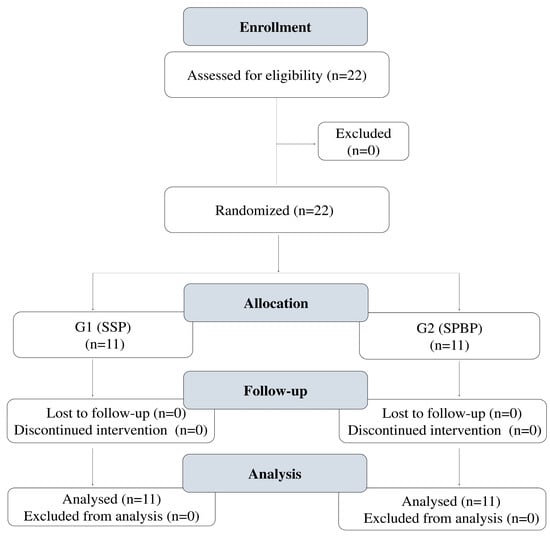 The team coach, under the supervision of the study’s lead author, randomly assigned the 22 players into two groups using a balanced randomization method. Players were first paired based on specific characteristics, such as prior performance, and then randomly allocated within each pair, ensuring that both groups had a similar composition with respect to these key variables. This ensured a fair and unbiased assignment. Following randomization, each group consisted of 11 participants (Figure 2).