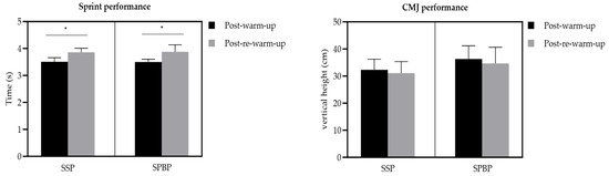 The discussion was structured to emphasize the comparative analysis between the two re-warm-up protocols, aligning with the study’s primary objective, rather than providing an exhaustive examination of each protocol in isolation. The data showed that sprint times significantly increased (indicating a decline in performance) after the re-warm-up in both protocols (SSP: +0.35 s; SPBP: +0.38 s; p = 0.001), with a large effect size. CMJ height decreased slightly (SSP: −1.2 cm, p = 0.074; SPBP: −1.6 cm, p = 0.074), suggesting small magnitude effects without statistical significance. These findings align with some previous studies [13], although other research has reported improved jumping and sprinting performance following re-warm-ups [20,28,48], highlighting the variability depending on protocol design and context.