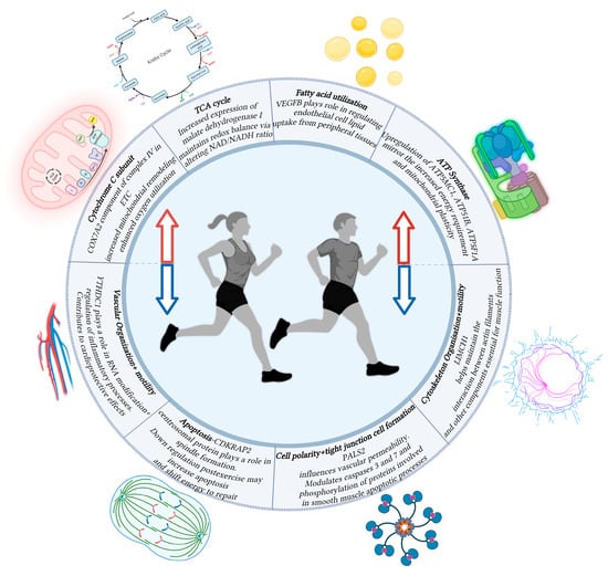 Interestingly, we also found a downregulation in two genes, LIMCH1 and CYMA5, that are involved in cellular organization and motility. Kadrmas and Beckerle [37] demonstrated that LIMCH1 was specifically involved in cytoskeletal organization and motility. Here we found that LIMCH1 was downregulated following exercise, which could be part of the body’s recovery response to conserve energy and focus on regenerative processes. The actin cytoskeleton is crucial for muscle contraction, cell movement, and maintaining cell shape. LIMCH1 helps modulate the interaction between actin filaments and other cytoskeletal components, which is essential for muscle function [38]. During exercise, the cytoskeleton actively maintains muscle integrity under mechanical stress [39]. After exercise, the immediate demand for this structural support decreases, which could explain the downregulation of LIMCH1. This downregulation might help reduce energy expenditure associated with maintaining and remodeling the cytoskeleton, allowing energy to be redirected toward other recovery processes. Through this process, cells might prioritize repair and adaptation processes, ensuring that muscle and vascular tissues recover effectively from the physical stress imposed by exercise.