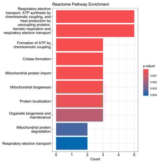 Figure 2. Reactome pathway enrichment analysis of differentially expressed genes following acute aerobic exercise. Genes significantly upregulated or downregulated in skeletal muscle post-exercise were analyzed using Reactome pathway enrichment analysis. The top enriched pathways are shown, ranked by log10(FDR-adjusted p-value). Key pathways include Respiratory Electron Transport, Aerobic Respiration, Mitochondrial Protein Import, and Protein Localization, indicating enhanced mitochondrial activity and energy metabolism.