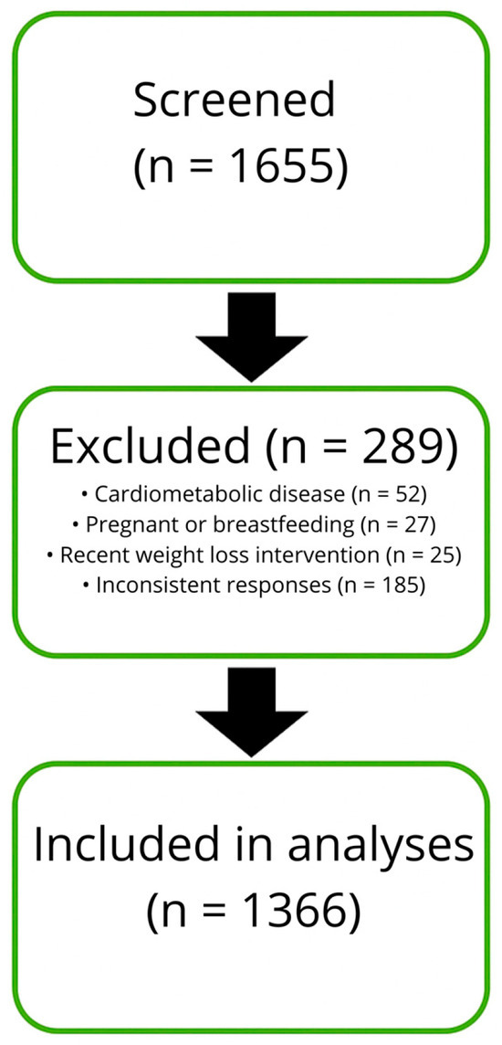 A total of 1366 participants met the inclusion criteria and provided complete data on anthropometric and behavioural variables. Food intake was assessed through structured food diaries, which were only available for participants who returned for a follow-up visit after receiving dietary recommendations at baseline. Therefore, analyses involving food frequency data were limited to this subgroup, while all other outcomes were examined in the entire cohort. Missing data were not imputed. Participants with incomplete responses or no follow-up diary were excluded from specific analyses, as appropriate.