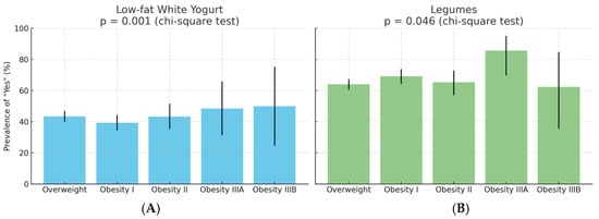 Prevalence of “Yes” responses for (A) low-fat white yoghurt and (B) legumes by BMI class. Bars indicate the observed percentage of participants in each BMI group reporting regular consumption. Error bars represent 95% binomial confidence intervals. Global comparison by chi-square test: p = 0.001 for yoghurt, p = 0.046 for legumes.