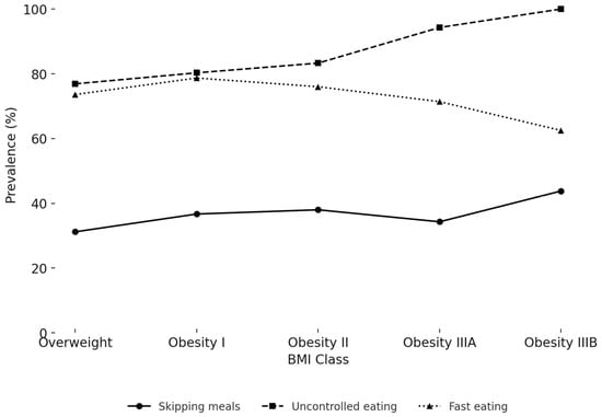 The age-adjusted prevalence of maladaptive eating behaviours across BMI classes is shown in Figure 3 and Supplementary Table S1. Uncontrolled eating was highly prevalent and increased with adiposity, from 76.9% in the Overweight group to 100% in class IIIB Obesity (p = 0.032). Fast eating showed a non-linear trend, with prevalence ranging from 62.5% to 78.7% (p = 0.039). Skipping meals was reported by 31.2% to 43.8% of participants, with significant differences between BMI categories (p = 0.034). Other behaviours, including snacking between meals and distracted eating, were frequent across all BMI classes (range: 55.3–81.2% and 62.7–68.8%, respectively) but showed no significant association with adiposity after age adjustment (p = 0.105 and p = 0.393, respectively). Night eating was less common (14.5–25.7%) and showed a borderline association with BMI class (p = 0.062).