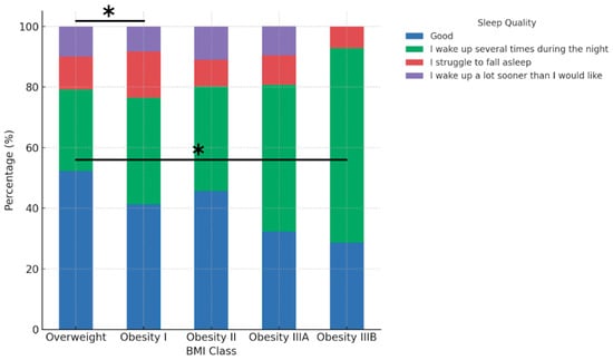 Sleep quality by BMI class. Asterisks indicate statistically significant pairwise differences after Bonferroni correction for multiple comparisons: Overweight vs. Obesity I (p = 0.045) and Overweight vs. Obesity IIIB (p = 0.049). Global association: chi-square p = 0.0038.