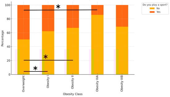 Sport participation decreased significantly with increasing BMI class (Figure 5). After adjustment for age, the probability of practising sport was highest in the Overweight group (48.8%), followed by Obesity I (37.8%), Obesity II (34.6%), and Obesity IIIA (15.9%). The global association between BMI class and sport participation was highly significant (chi-square p < 0.0001). Pairwise post hoc tests with Bonferroni correction confirmed that the probability of practising sport was significantly higher in the Overweight group than in Obesity I (adjusted p = 0.0019), Obesity II (adjusted p = 0.0025), and Obesity IIIA (adjusted p = 0.0009).