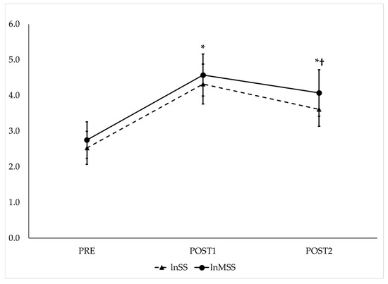 | lnMSS | 2.75 ± 0.51 | 4.57 ± 0.59 * | 4.07 ± 0.65 *† | −3.30 Very Large | −2.26 Very Large | 0.81 Moderate |