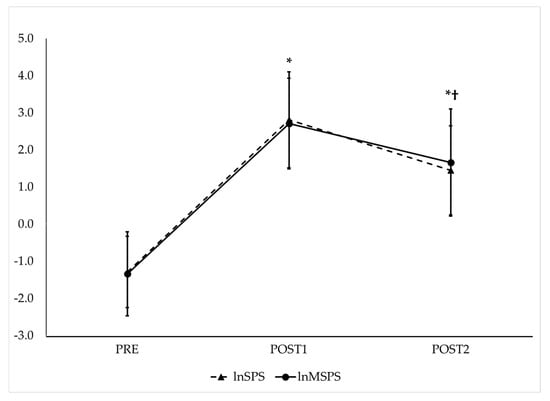 | lnSPS | −1.29 ± 0.96 | 2.81 ± 1.29 * | 1.45 ± 1.20 *† | −3.61 Very Large | −2.52 Very Large | 1.09 Moderate |