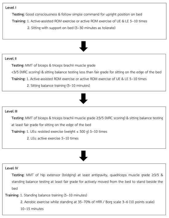 All the patients underwent rehabilitation under the supervision of a licensed physical therapist. During postoperative weeks 1 and 2, the patients followed a conventional treatment focused on respiratory hygiene, breathing exercise, and bed mobility. In postoperative weeks 3–4, patients transitioned to a structured exercise consisting of inspiratory muscle training (IMT), which was conducted twice daily using the POWERbreathe KH2 device (POWERbreathe International Ltd., Southam, UK). Training began at 40% PImax and progressed to 60%, targeting a Borg RPE of 3–5. Each session included 30 breaths (3 sets of 10) with a 1 min rest between sets, following Thammata et al. (2021) []. The early mobilization program was performed once daily using a progressive four-level protocol []. Exercise modalities included bedside stepping, hallway walking, and progressive ambulation, based on patient tolerance and monitored clinical signs. All training sessions were performed five days per week. The program is illustrated in Figure 1.