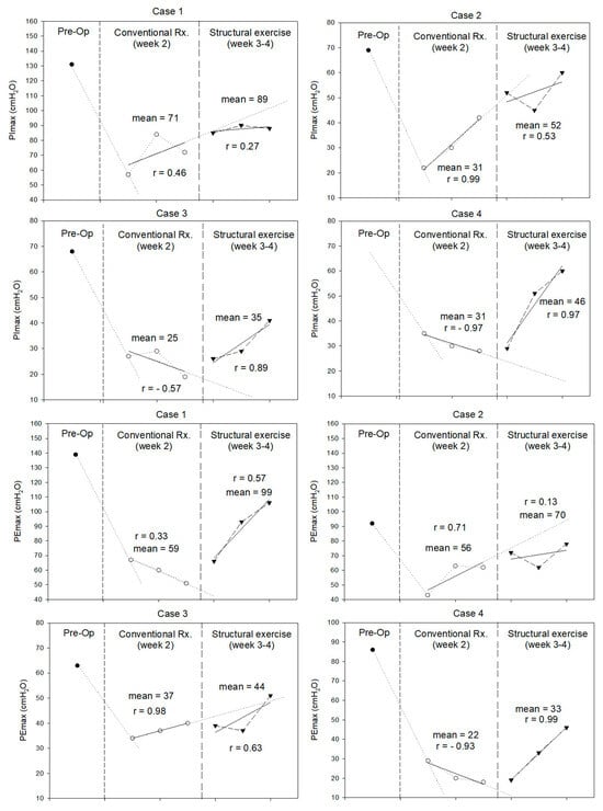 Maximal inspiratory pressure (PImax) and maximal expiratory pressure (PEmax) (in cmH2O) measured during pre-operation, conventional treatment, and structural exercise of each case.