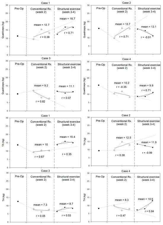 The results for lower-extremity muscle strength are shown in Figure 3. Quadriceps strength declined postoperatively in three patients. Whereas two patients had decreased TA strength. During weeks 3–4, structured exercise improved quadriceps and TA strength in female patients (Cases 3 and 4) and younger patients (Case 1 and 4), respectively.
