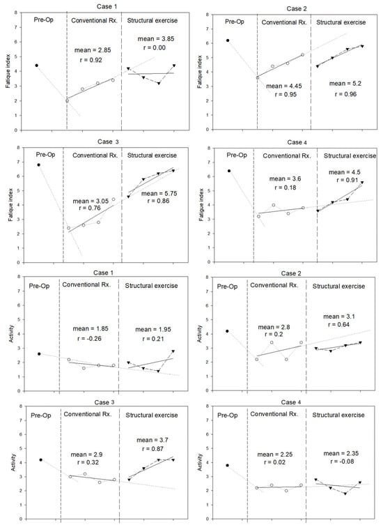 Quality of life was assessed using the fatigue and activity domains of the CLDQ. The trends are illustrated in Figure 4. All patients expressed more fatigue and less activity immediately after the surgery. During structured exercise, patients expressed no change in fatigue index compared with conventional periods. However, two cases had a trend of improvement. None of the participants returned to their preoperative levels. Two patients improved the activity domain during the structured exercise period and regained their preoperative scores.