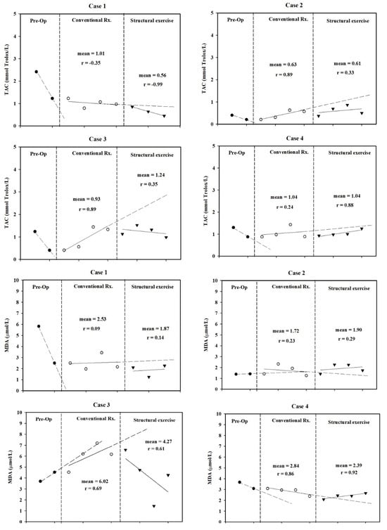 Total antioxidant capacity (TAC) and malondialdehyde (MDA) levels were measured at three time points pre-operation, during conventional treatment, and during structured exercise for each case.