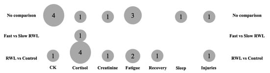 | [29] | 12 | M | Wrestling | 24.30 ± 5.10 | Crossover study with initial measurement (IM), RWL + HISST (P1), and HISST alone (P2) | Self-chosen RWL methods to reduce 5% body mass in 3 days; details of restriction not provided | CK | Blood samples (8 mL) | RWL caused greater increases in muscle damage markers (Mb, CK, ALD, AST, ALT, LDH) |