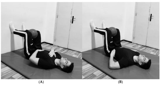 The protocol emphasized diaphragmatic breathing, explicitly targeting the activation of the diaphragm and three-dimensional chest expansion. The participants began in a bridge position with their legs in a 90/90° hip/knee configuration while holding a rubber ball between their knees. They maintained a supine position with their feet placed against a wall, ensuring neutral neck and spine alignment. This passive 90° hip and knee flexion position induced relative lumbar spine flexion, posterior pelvic tilt, and internal rotation and depression of the rib, which together facilitate optimal breathing mechanics and proper diaphragm activation. The inclusion of a rubber ball between the knees promoted adductor muscle engagement and co-contraction of the pelvic floor muscles [39].