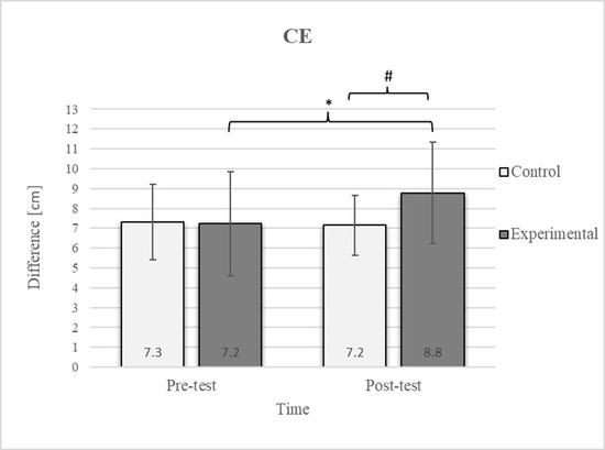 Group homogenization was successful: CE pre-test results showed no difference, and the mean values were similar between groups (Figure 2). Additionally, significant differences between the groups in the pre-test were not found for most variables, except for the TSR (Figure 3).