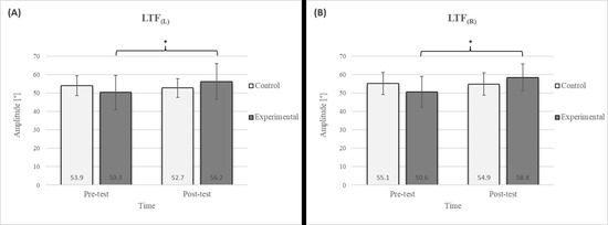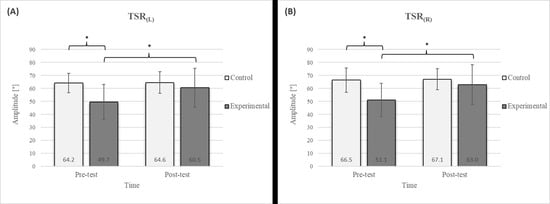 Descriptive statistics and post hoc analysis for lateral trunk flexion test: (A) to the left and (B) to the right at pre-test and post-test for control and experimental group (n = 13). *—statistically significant difference (p ≤ 0.05).