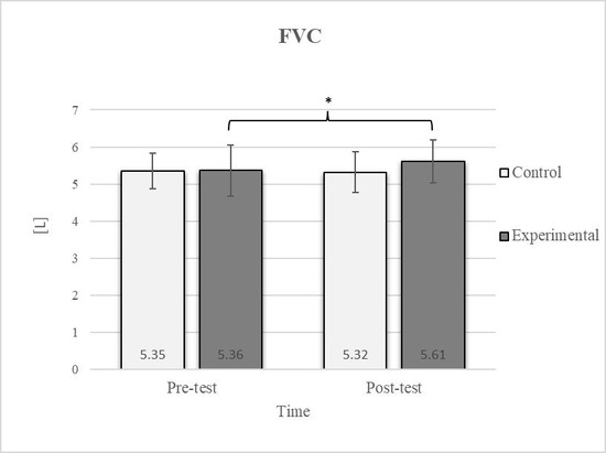 Descriptive statistics and post hoc analysis for force vital capacity at pre-test and post-test for control and experimental group (n = 13). *—statistically significant difference (p ≤ 0.05).