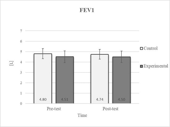 Descriptive statistics and post hoc analysis for ratio of force vital capacity and force expiratory volume in first second at pre-test and post-test for control and experimental group (n = 13). *—statistically significant difference (p ≤ 0.05).