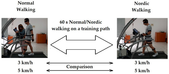 Nordic walking (NW) has gained popularity under various names such as ski walking, walking with sticks or fitness walking. This sport appeared with the original purpose of filling the break of the ski season. Nordic walking is a combination of cross-country skiing and regular walking (RW). It can be practiced all year round and anywhere. NW originated in Finland a few decades ago. In recent years, it has become extremely popular and more than 14 million people are already using it as a means of maintaining their condition worldwide. In recent years, NW has been widely used by both athletes in training and by ordinary people for health. It is done with walking sticks, as an aid to traction, better stability and inclusion of the hands when moving [1]. Although relatively recent, its international development is significant due to its advantages [2,3,4,5,6,7].