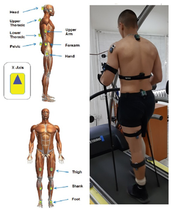 Motion analysis is conducted with the 3D MioMotion (MR3.18) IMU sensor analysis system (Noraxon, https://www.noraxon.com/), utilising compact inertial sensors that are positioned on specific body segments as indicated in Figure 2. The obtained kinematic data was acquired with sampling rate 200 Hz. The data was collected from 9 IMU sensors positioned in groups of 3 items on left lower and upper limbs and on the spine (Figure 2). From this interaction structure five parameters are studied in all 3 spatial directions for two different speeds—3 and 5 km/h—Upper spine, Lower Thoracic, Lumbar, Pelvis. All tests were repeated for RW and NW.