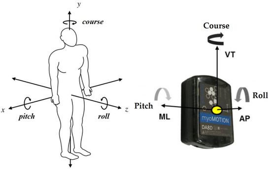 The plots for lower spine course, pitch and roll data of two walking velocities (3 km/h data is on left, 5 km/h data is on right) are shown in Figure 10, Figure 11 and Figure 12.