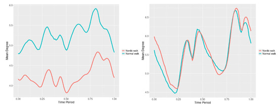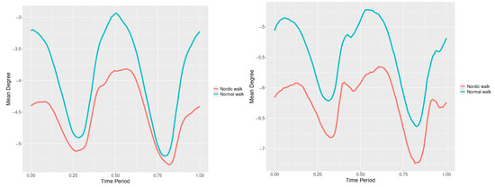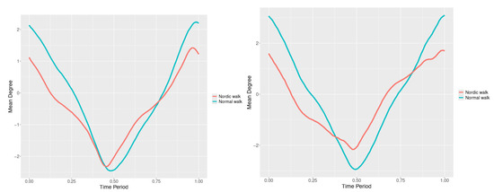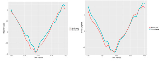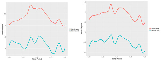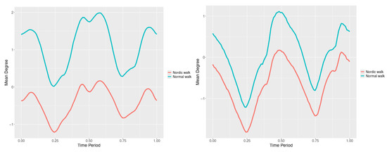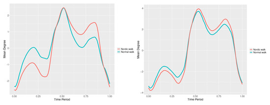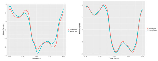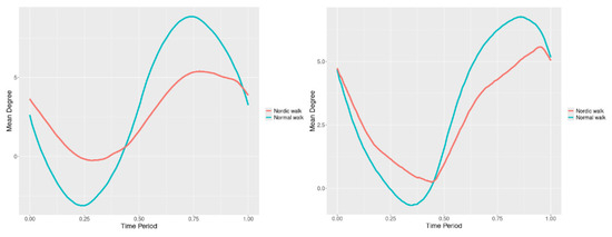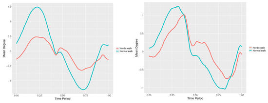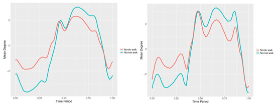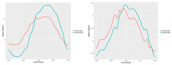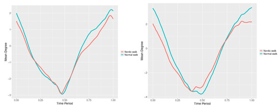 Lower spine pitch mean functions of two walking velocities (3 km/h data is on (left), 5 km/h data is on (right)). The L2-norm mean differences are 0.693 for the 3 km/h speed test and 0.825 for the 5 km/h speed test.