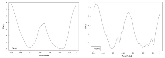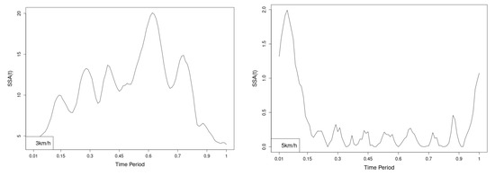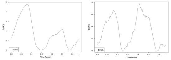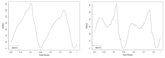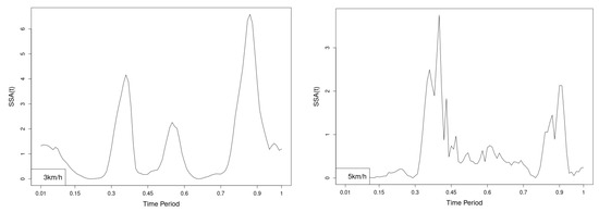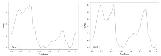 Pointwise SSA(t) statistics for upper spine roll angle at 3 and 5 km/h.