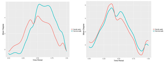 Lower spine course mean functions of two walking velocities (3 km/h data is on (left), 5 km/h data is on (right)). The L2-norm mean differences are 2.64 for the 3 km/h speed test and 1.731 for the 5 km/h speed test.