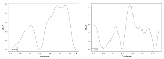 The pointwise statistic’s estimates in which part of the cycle we have clearly expressed statistically significant differences in SSA(t). It can be seen that this statistical differences varies according the concrete cycle. The level of the maximum of the curves on Figure 7, Figure 8 and Figure 9 (as with all similar graphs further down in the text for the other measured parameters) indicates a significant difference at the corresponding location of the corresponding cycle for concrete parameter. The maximum values of the SSA(t) curve show the cycle points at which we have the maximum statistically significant difference between the compared walking modes. The minimum values of the curve (near to 0) show the cycle points at which the twist trajectories coincide.