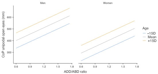 In summary, younger participants, women, and more frequent skaters (>5 d/w) demonstrated better unipodal balance. Also, it seems that a lower ratio on ADD/ABD (i.e., more balanced strength) combined with higher ADD strength was associated with reduced CoP displacement (Figure 3).