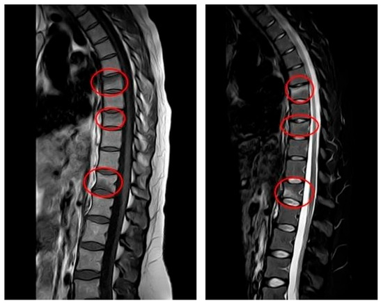 After initiating conservative treatment, the MRI after 90 days was carried out and the results showed a complete disappearance of the vertebral compression fractures. All previously identified fractures were stabilized and the previously noted edematous band in the spongy part of the vertebral body had disappeared (Figure 2).