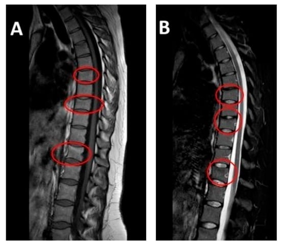MRI at follow-up (April 2024, at four-month postpartum follow-up): repeat sagittal MRI showing resolution of edema and stabilization of previous vertebral compression fractures. Vertebral alignment is preserved with no evidence of new pathology. Subfigure (A) on the left shows T1-weighted sequence on the left. Subfigure (B) shows T2-weighted sequence on the right.